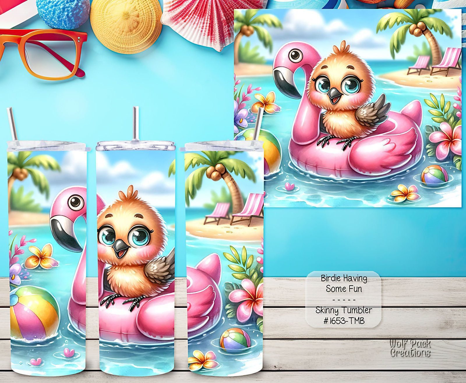 This tumbler is cute with the bird floating on a pink flamingo.