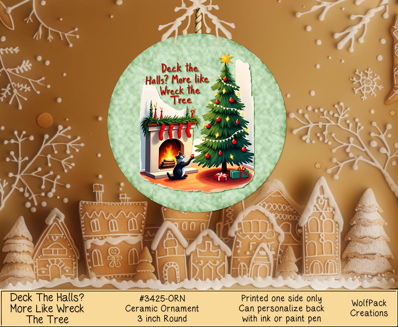 Add a purr-fect touch of holiday cheer with our Deck the Halls ornament! This ceramic round ornament featuring a festive cat design is a must-have for your Christmas tree or fireplace décor. Spread merry and bright vibes this holiday season with this unique and charming decoration.