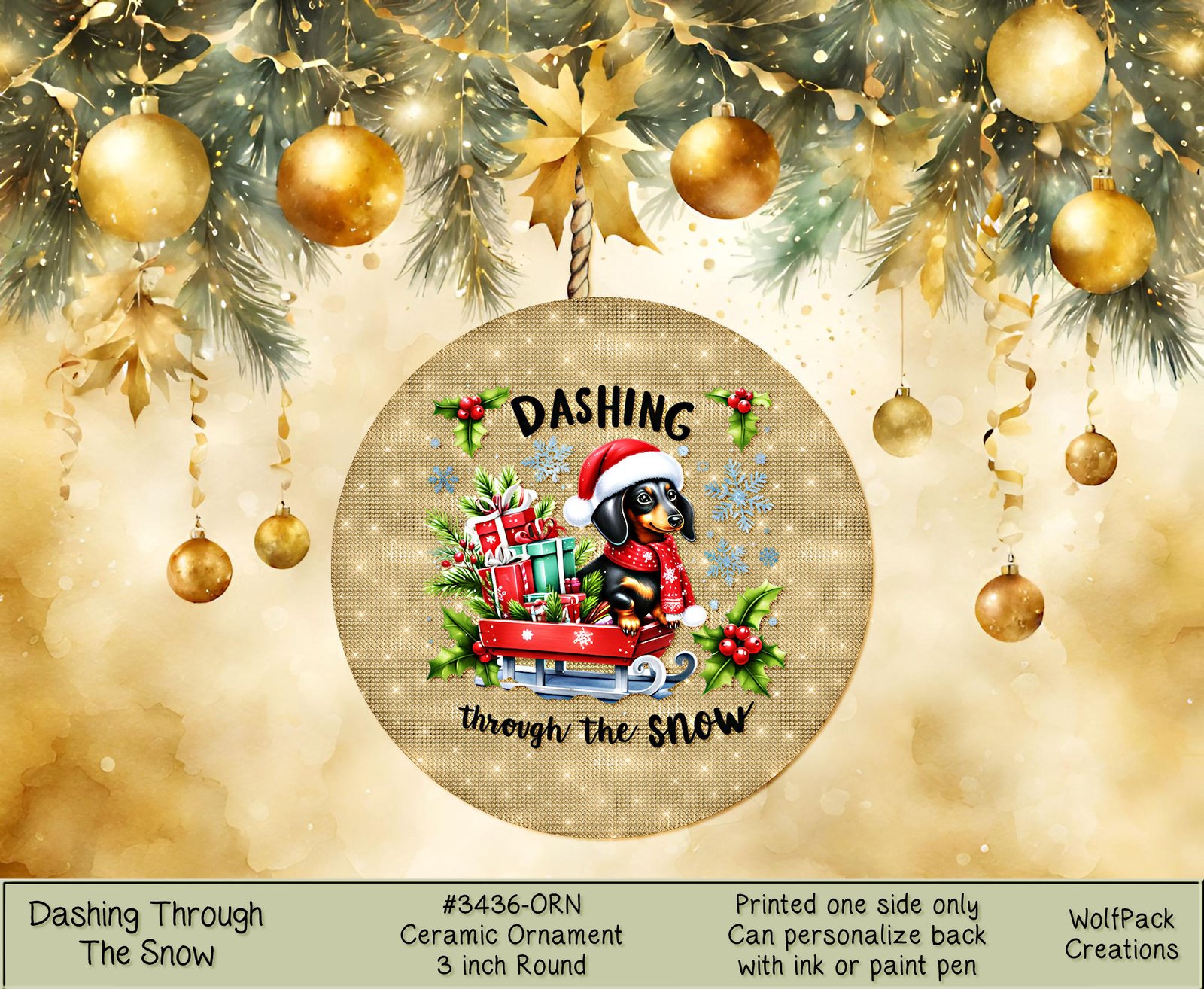 Make your Christmas tree sparkle with our Dashing Through the Snow Ornament featuring a cute dachshund in a sleigh design. Crafted from high-quality ceramic, this round holiday ornament exudes merry cheer with snow and holly berries. Perfect for gifting or adding a festive touch to your own decor.
