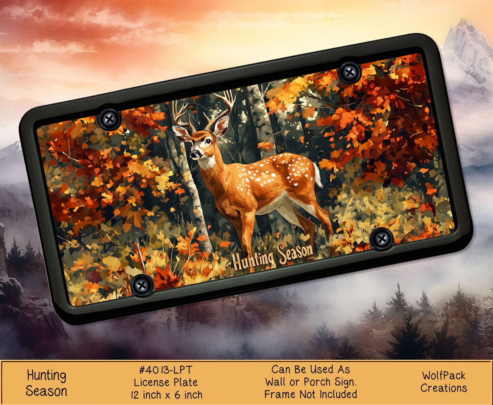 Elevate your vehicle with our Hunting Season License Plate. Crafted with durable materials, this vanity plate showcases a stunning deer design amidst a backdrop of fall leaves and forest. Perfect for hunters and outdoor enthusiasts, this plate is a must-have to showcase your passion for the woods.
