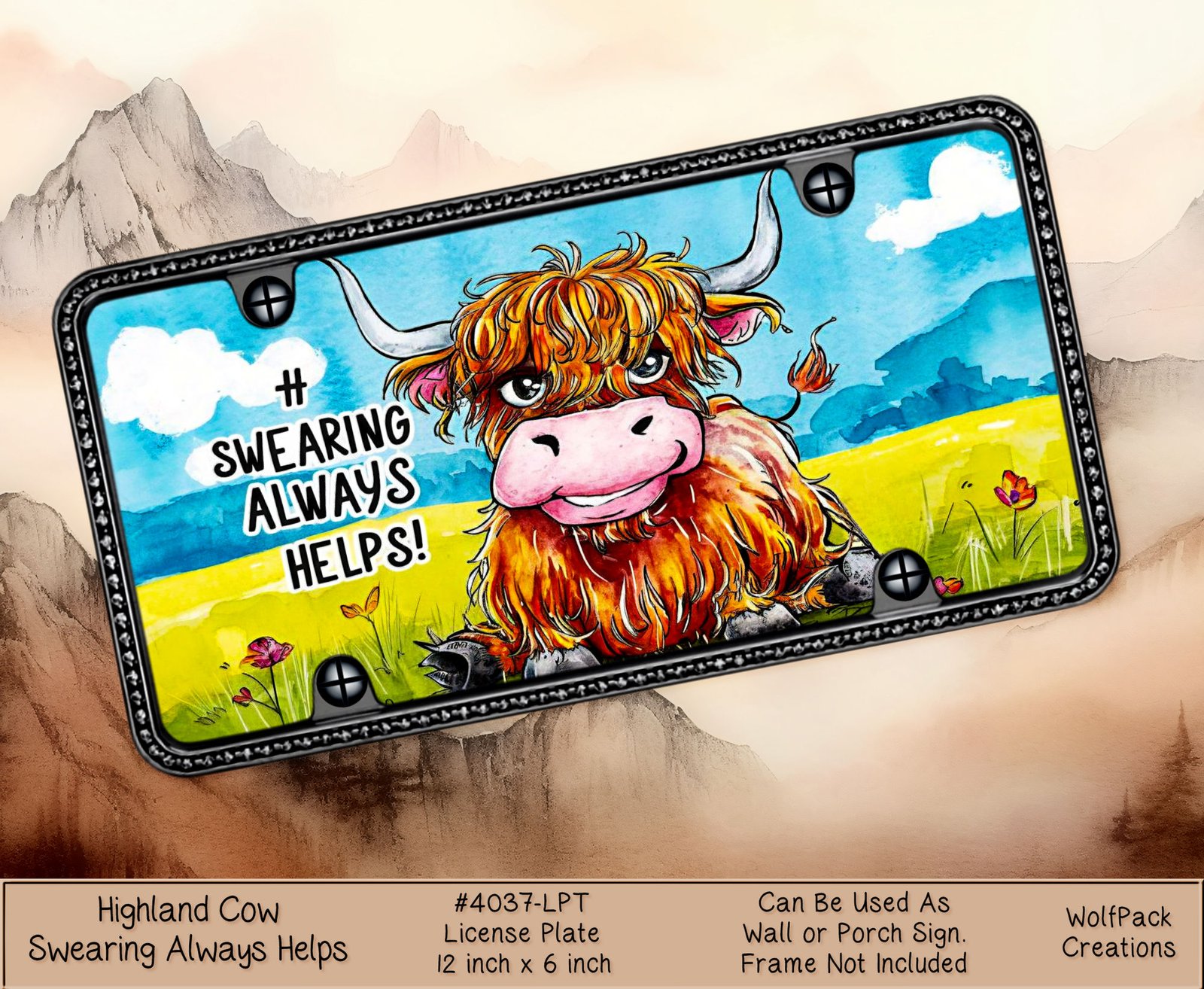 Add a touch of whimsy to your vehicle with our Highland Cow License Plate. Featuring a charming highland cow set against a scenic backdrop of rolling fields and fluffy clouds, this vanity plate is perfect for animal lovers. Durable and eye-catching, it’s a unique way to showcase your love for these majestic creatures on the road. Make a statement with our Highland Cow License Plate today!