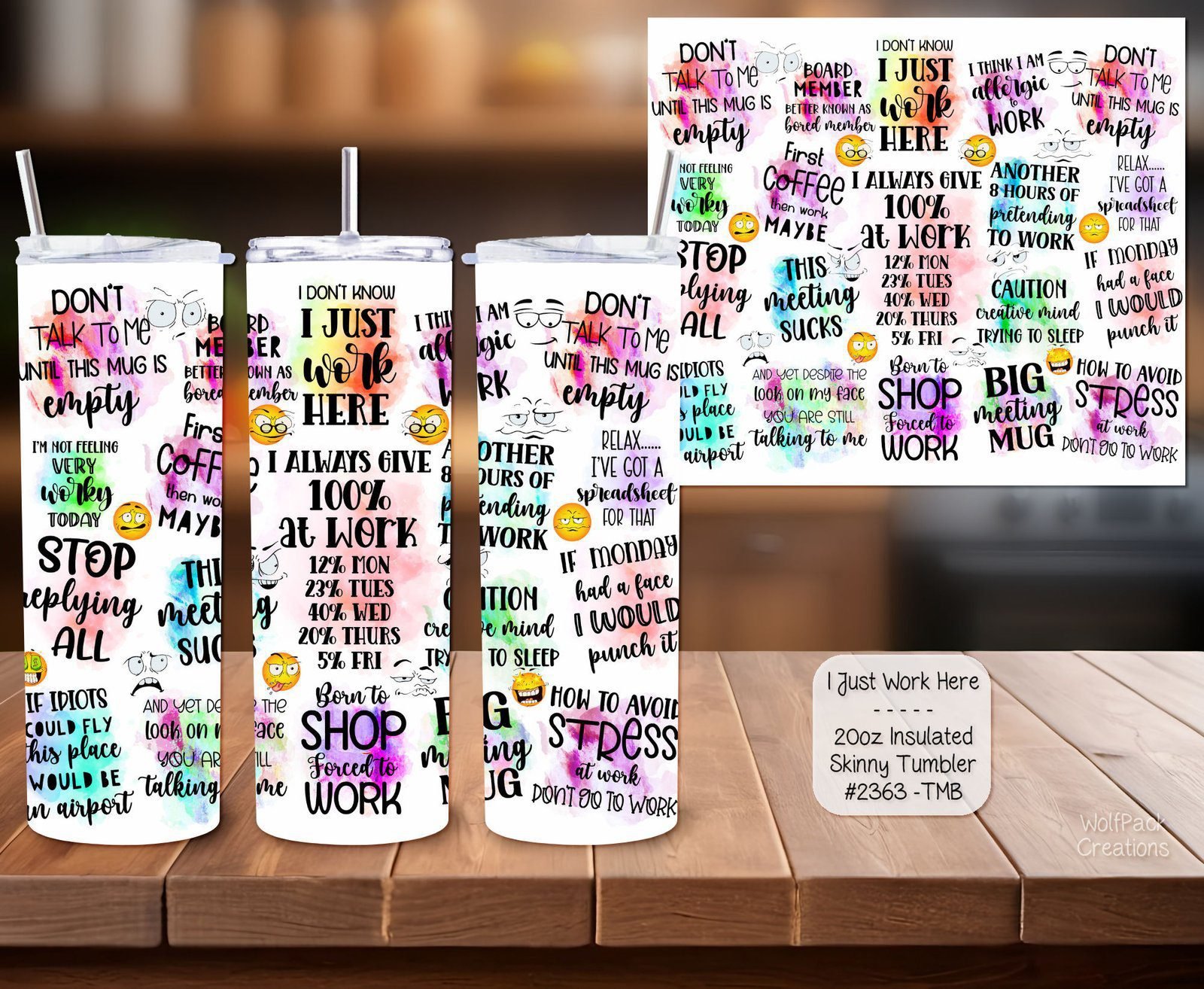 With the phrase ‘I just work here’ elegantly displayed, this tumbler adds a dash of personality to your daily hydration routine. Embrace the fun while enjoying your favorite drinks in this stylish, stainless steel tumbler.