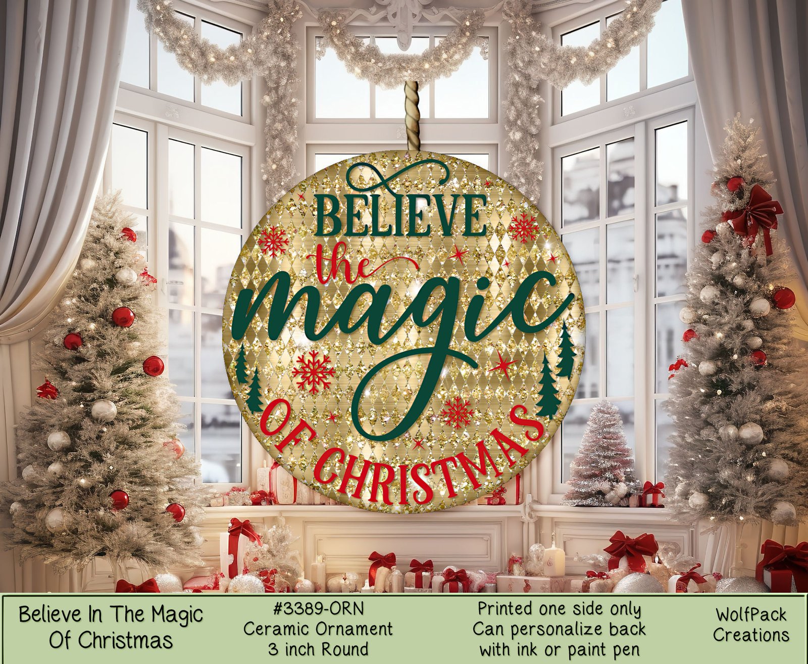 Add a touch of festive charm to your holiday decor with our 3″ Ceramic Christmas Ornament. Embrace the magic of Christmas with its enchanting design and timeless “Believe in the magic of Christmas” message. This round ornament is a merry addition to your Christmas tree or perfect as a gift for loved ones. Elevate your holiday celebrations with this special keepsake.