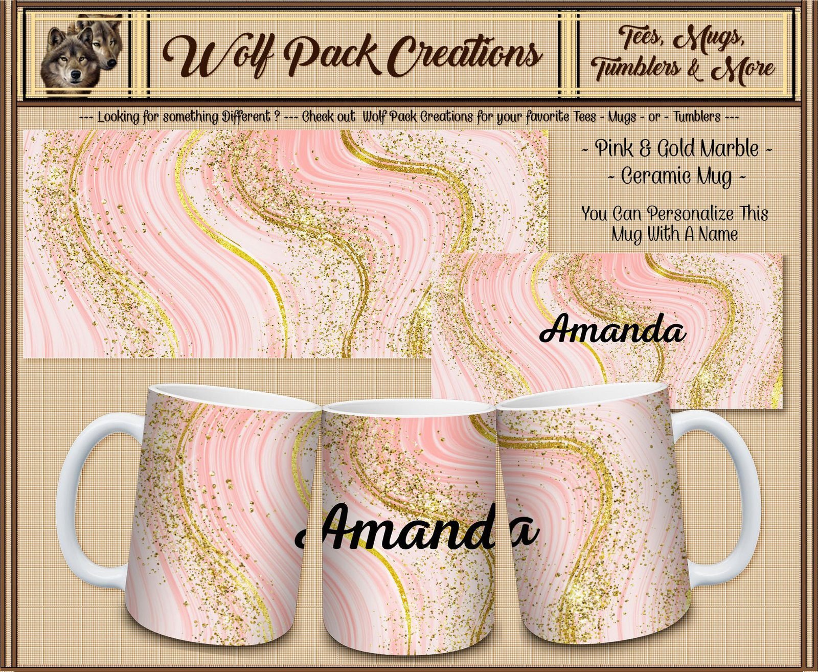 In summary, our ceramic coffee mugs offer both style and personalization options, making them a must-have for any coffee lover. Available in 11-ounce and 15-ounce sizes, and featuring a stunning pink and gold marble design, these mugs are perfect for adding a bit of luxury to your daily routine. Don’t wait – get your personalizable coffee mug today!