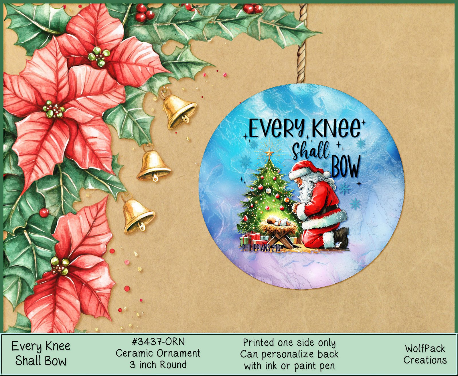 Enhance your holiday decor with our exquisite “Every Knee shall bow” ornament. Crafted from high-quality ceramic, this round ornament features a heartwarming scene of Santa, the Christmas tree, and baby Jesus. Perfect for adding a touch of festive charm to your Christmas tree. Capture the true spirit of the season with this unique ornament that will make every visitor’s heart glow with joy.