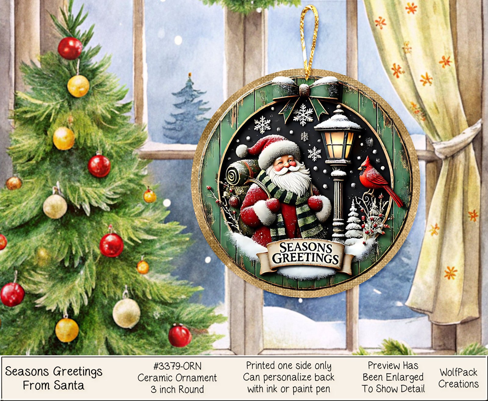 Add a touch of whimsy to your Christmas tree with our charming Seasons Greetings from Santa Ornament. Crafted from high-quality ceramic, this round ornament features a jolly Santa surrounded by snow and a cardinal. The exquisite detailing and elegant gold ribbon make it a festive addition to your holiday decor.