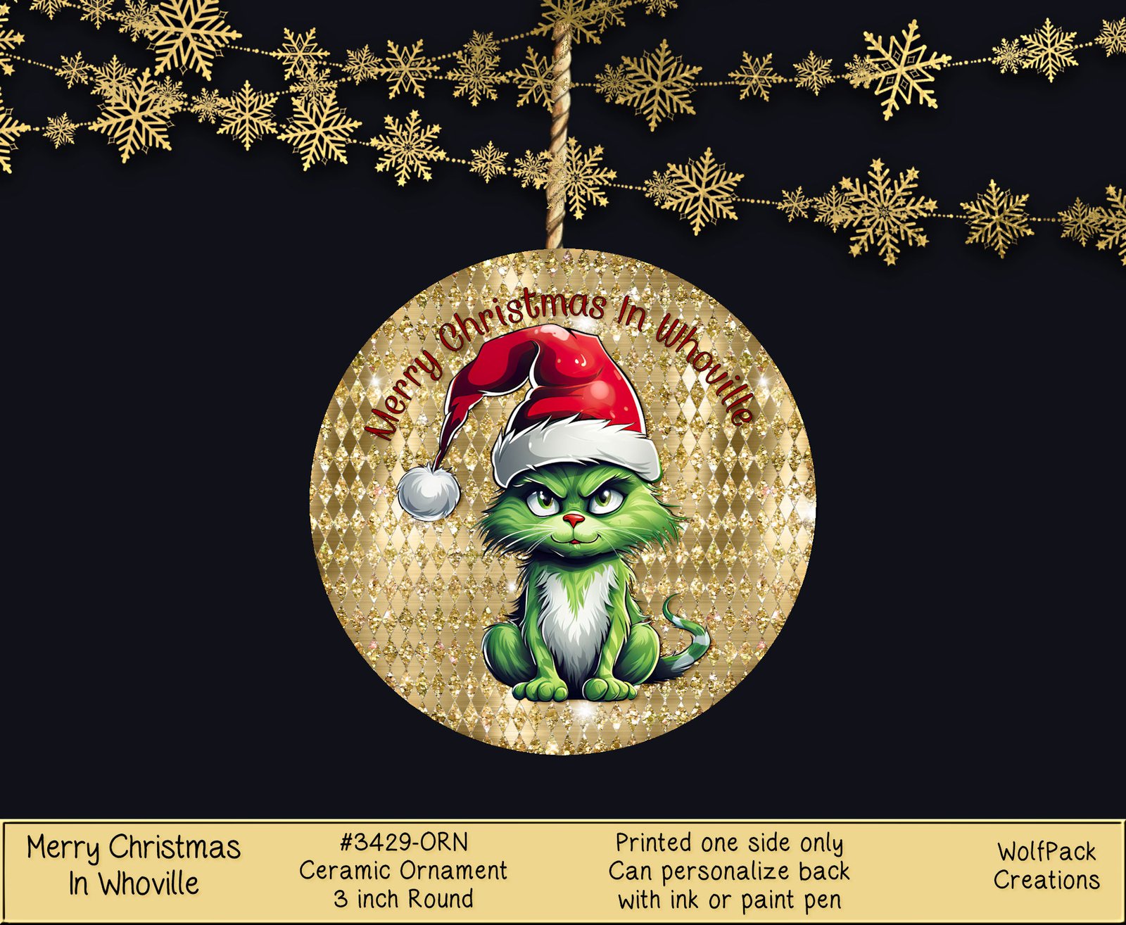 Add a whimsical touch to your Christmas tree with our Grinch Cat Christmas Ornament. This ceramic ornament features a cute cat wearing a Santa hat, bringing holiday cheer to your decor. Its unique design inspired by Whoville and accented with gold adds merry charm to your festivities. Make your Christmas tree stand out with this adorable ornament!